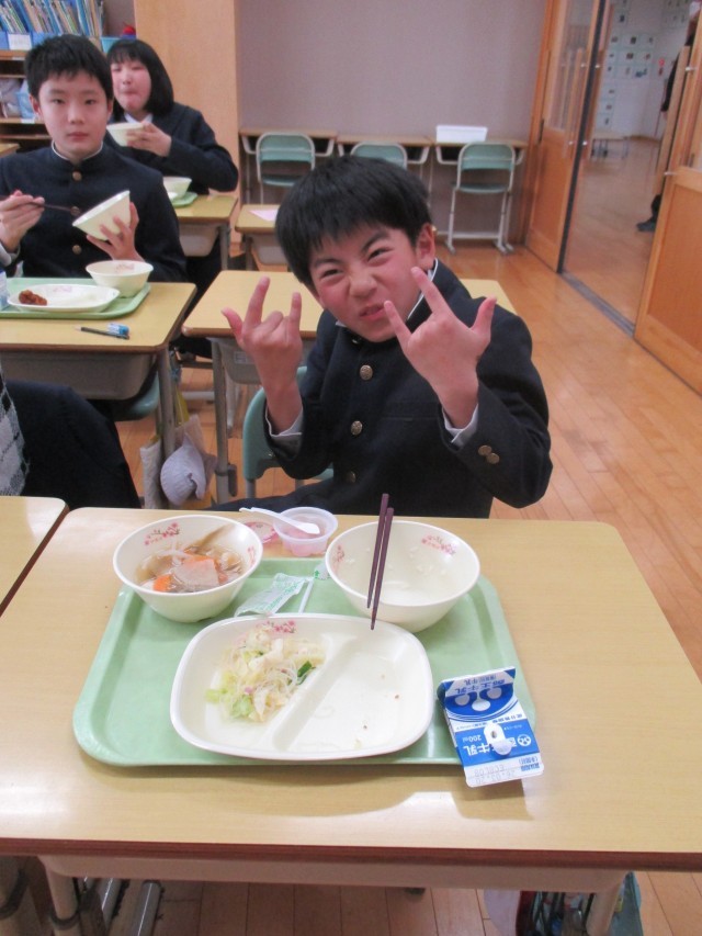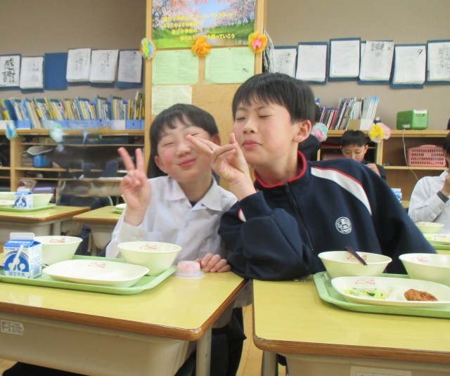 今日の給食は、卒業する6年生のための献立!楽しそうに食べている6年生、あと小学校の給食はあと何回なんだっけ?数えてみたらなんと、あと5回!明日もよくかみしめて食べなきゃね!