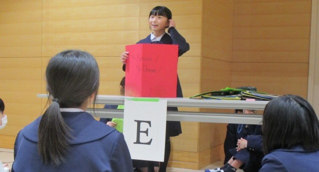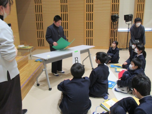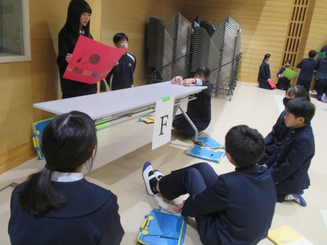 こちらは2組と3組の交流授業。外国語専科の先生のアイディアで、中学校のことや将来の夢のことを、英語で伝え合っています!さすが、1年間の学びって、すごいですね!