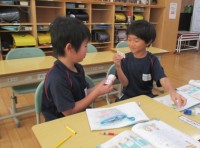 青空の下、1年生はかけっこの練習中。「ドキドキしてきた!」「また2番だ!」初めてのことがたくさんの1年生ですが、どんなことにも一生懸命取り組んでいます。スポーツフェスティバルまであと1ヶ月です!