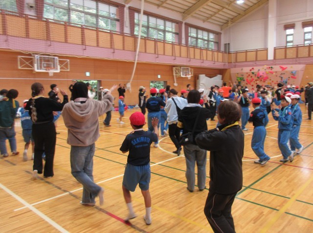 雨のため、体育館で保護者や地域の方と一緒に堰本音頭を踊りました。