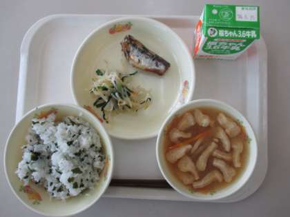 本日の給食の献立は、「わかめごはん、牛乳、エノキとじゃがいものみそ汁、鰯の梅煮、もやしとニラのおひたし」でした。