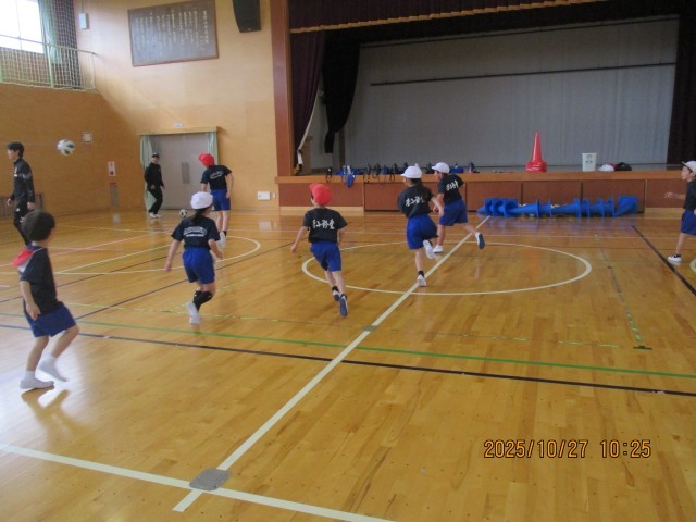 低学年は、作戦を立ててゲーム形式でサッカーの面白さを味わいました。中学年も作戦を立ててゲームを行いますが、2つのボールでスリルを味わうゲームを体験しました。高学年は、まずロングパスの練習からはじまりました。