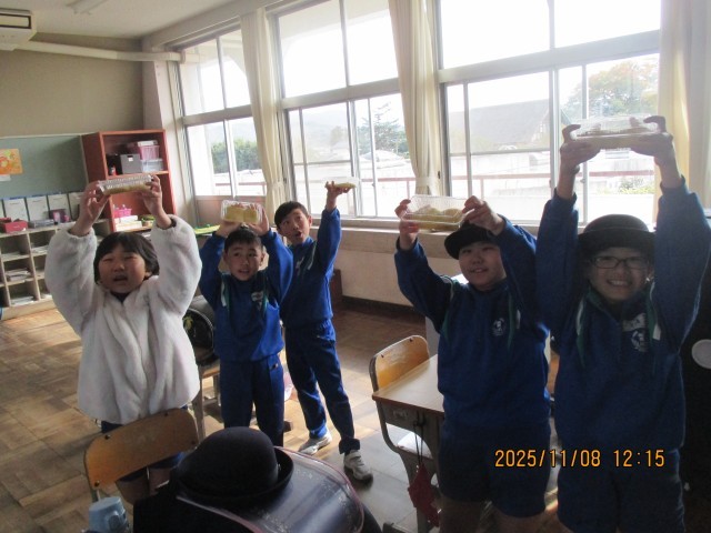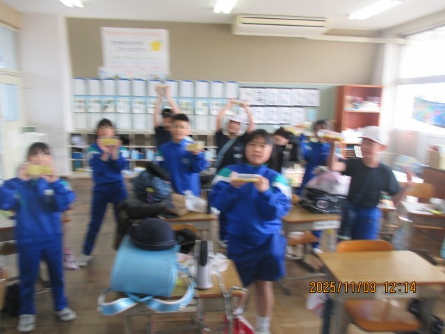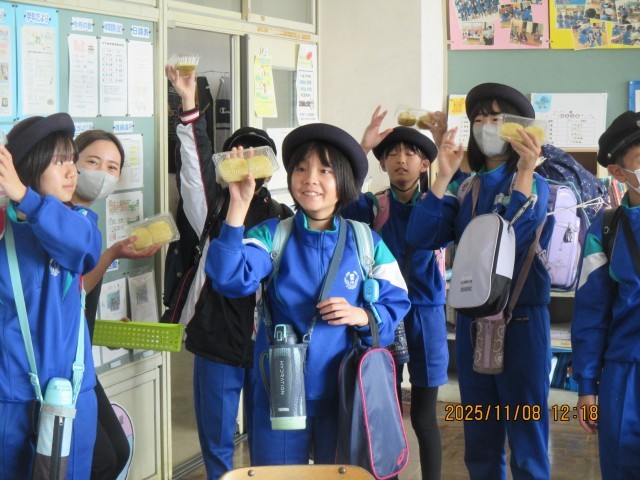 三世代ふれあい活動の最後は、おもちをもらってにっこり!!下校をしました。