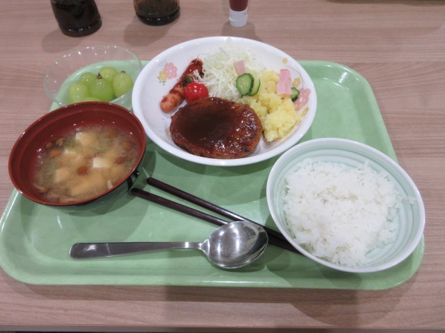 おいしそうなハンバーグやポテトサラダ、なめこと豆腐の味噌汁などが並びます。