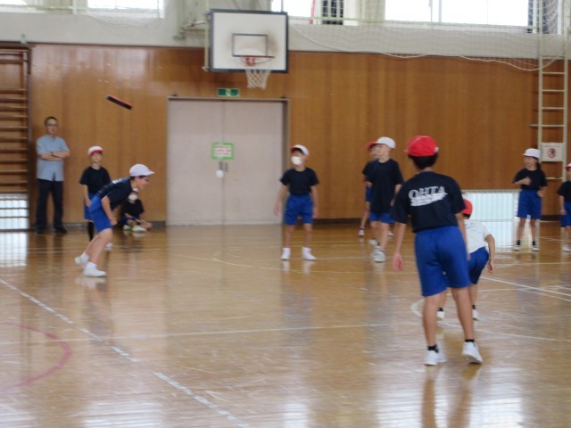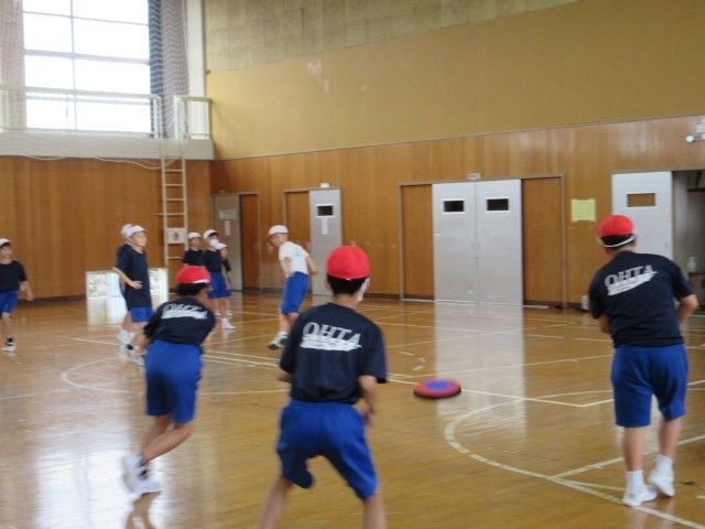 体育館でドッジビー、校庭でけいどろ、1~6年生が一緒に遊びます。