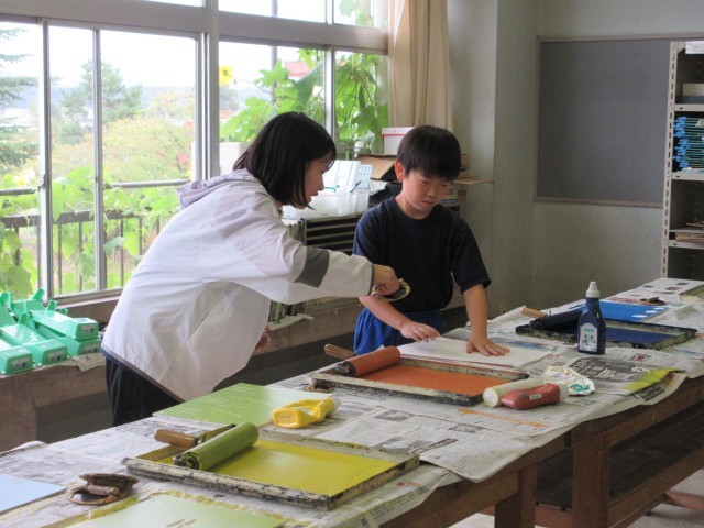 5年生の図画工作科では、多色版画に挑戦です。どの部分を彫って何色で刷ったらよいか考えながら作品を制作します。