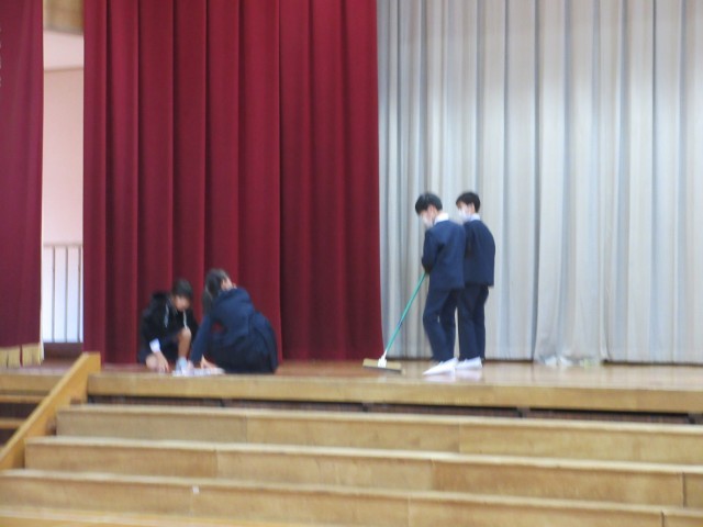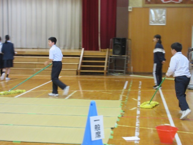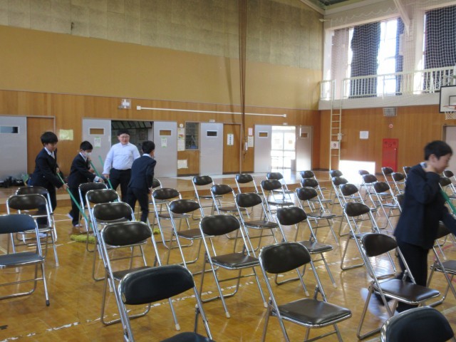 保護者・来賓用の椅子をならべてぞうきんでふいたり、モップがけをしたり。