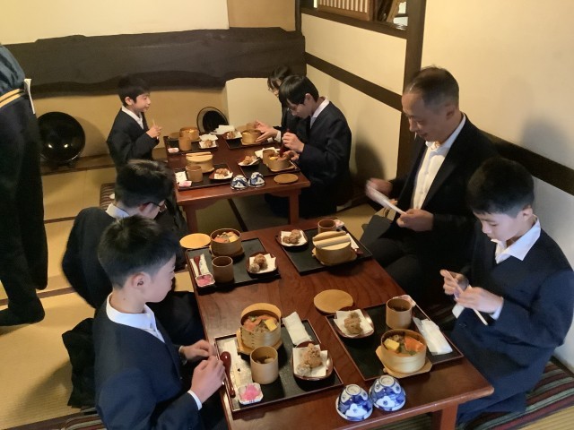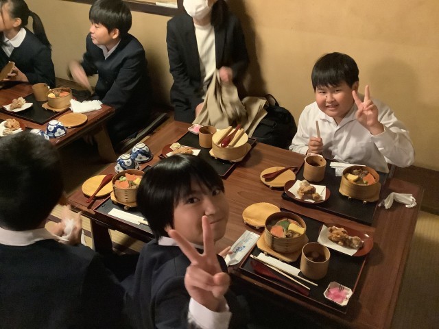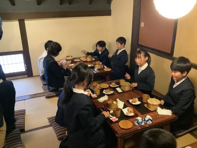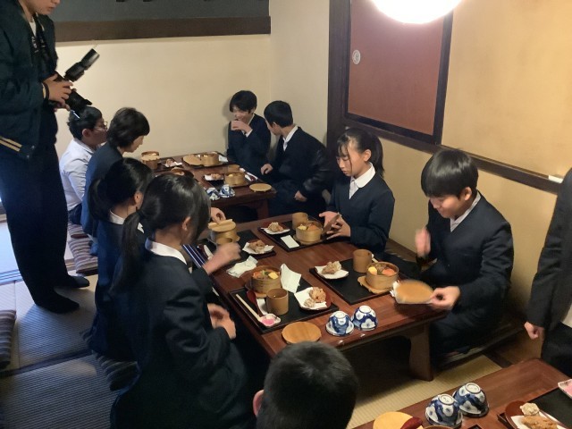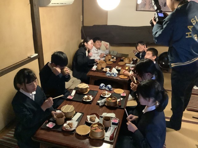 鮭やきのこがたくさん入ったわっぱ飯や鶏の唐揚げ、まんじゅうの天ぷらをみんなでおいしくいただきました。