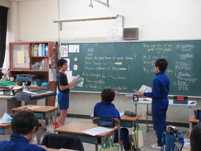 5年生の外国語科の授業では、ALTのナバロ先生と一緒に「Let's go to the zoo.」の学習です。英語で会話をしながら友だちを目的地まで案内します。