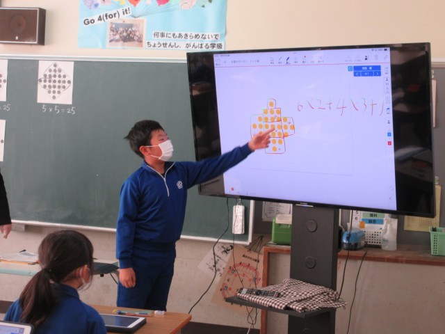 「○の数を簡単に求めるには?」どんな方法、どんな式で求めればよいか、タブレットの図を使って考えます。