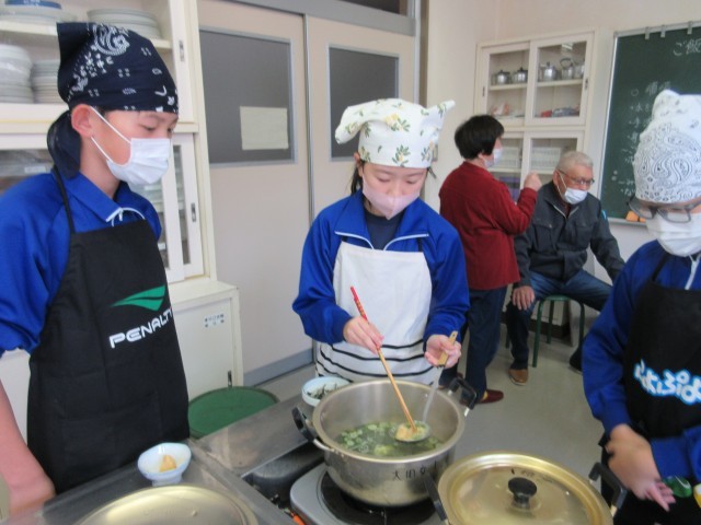 みんなで協力して、なべでご飯を炊き、にぼしでだしをとったみそ汁を作り、菅野さんと一緒においしくいただきます。