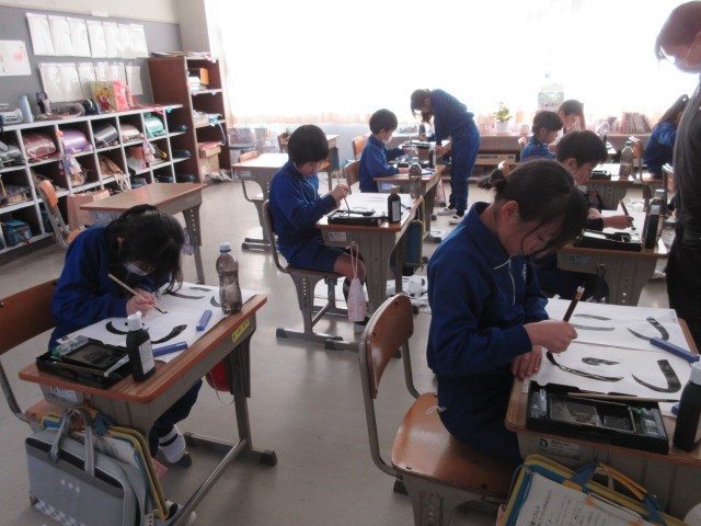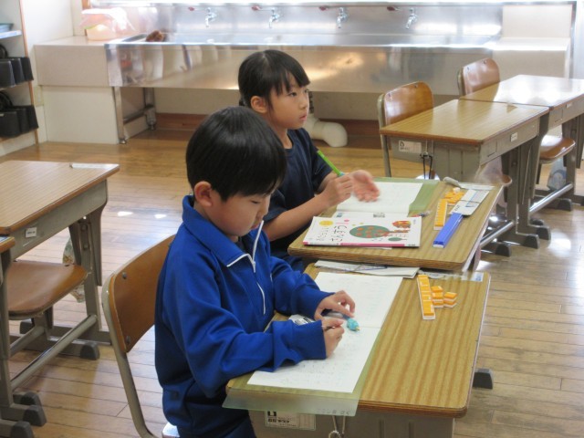 先生の話を聞くときやノートに字を書くとき、良い姿勢で学習している1年生、とてもすばらしいです。