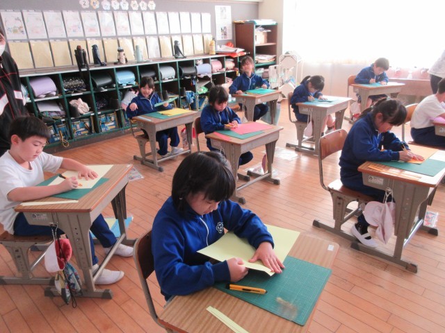 2年生の図画工作科の授業では、「わくわくカッターナイフ」の学習です。けがに注意しながら、直線や曲線をカッターナイフで上手に切ることができました。
