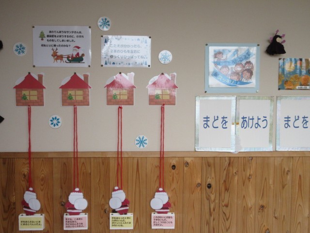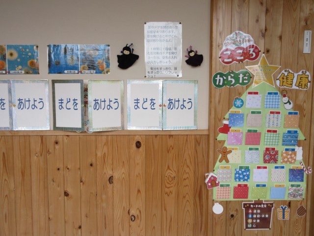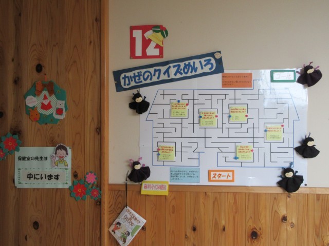 今月は、「かぜのクイズめいろ」「感染症予防」「換気」「元気にすごすためのアドベントカレンダー」の工夫がいっぱいの素敵な掲示です。
