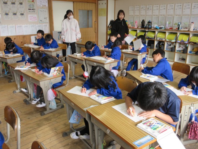 最後には、ナバロ先生から「bookmark(しおり)」のプレゼント。色鉛筆で塗って、素敵なしおりの完成です。