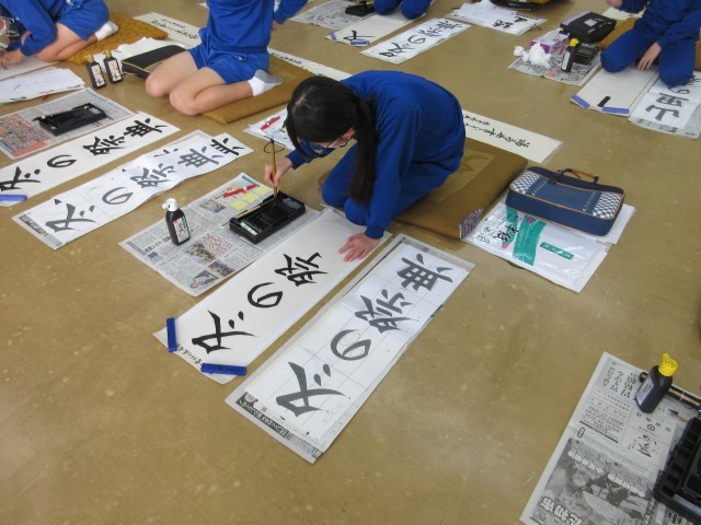 5年生は「山里の春」、6年生は「冬の祭典」の書きぞめに挑戦します。