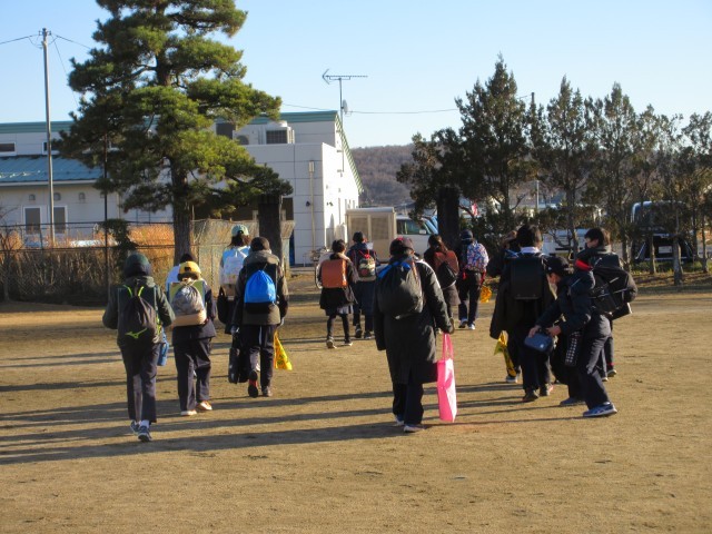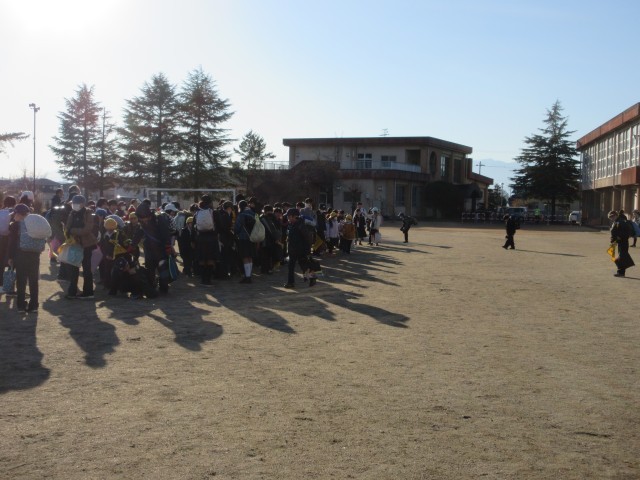 登校班や児童クラブの班に分かれ、6年生のあいさつの後、下校します。
