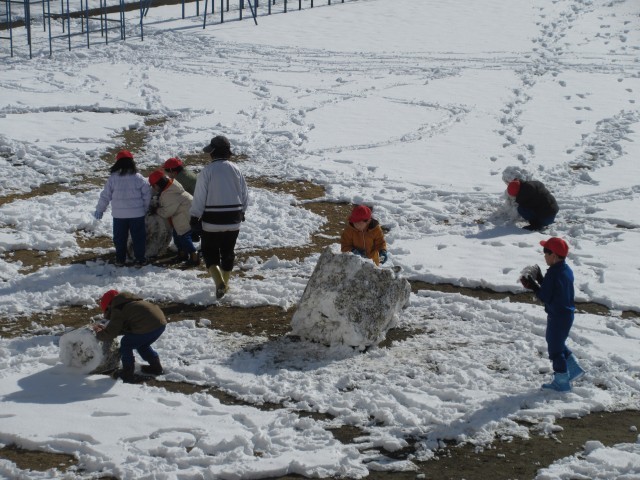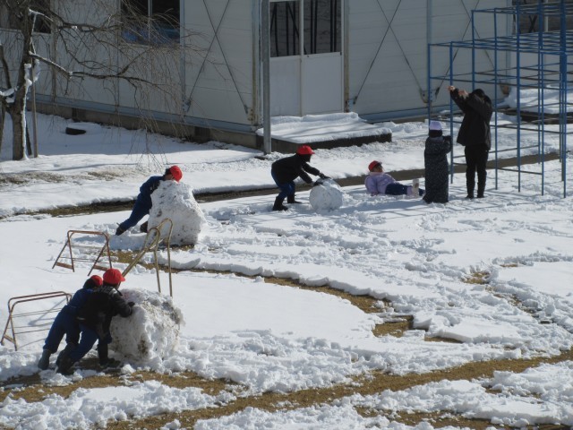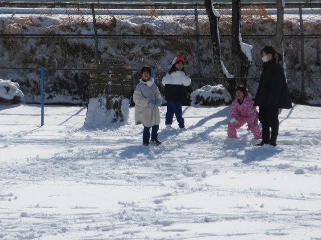 業間休みで作った大きな雪玉を転がしてさらに大きくしたり、雪玉を作って投げたり、楽しく遊びます。