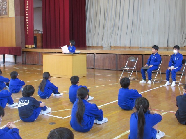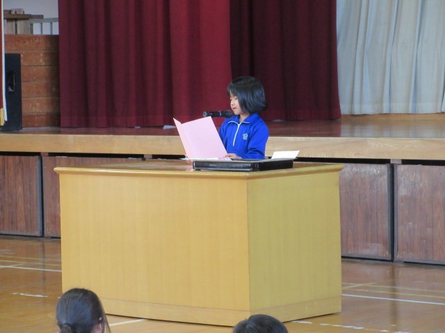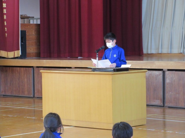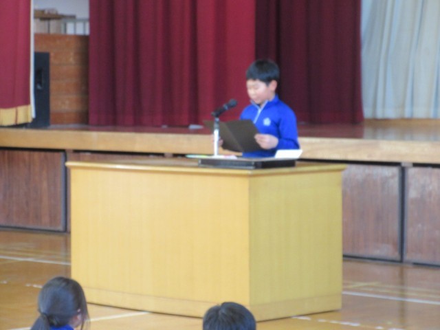 全校集会で、2・4・6年生の代表児童が「冬休みを振り返って・3学期のめあて」を発表しました。
