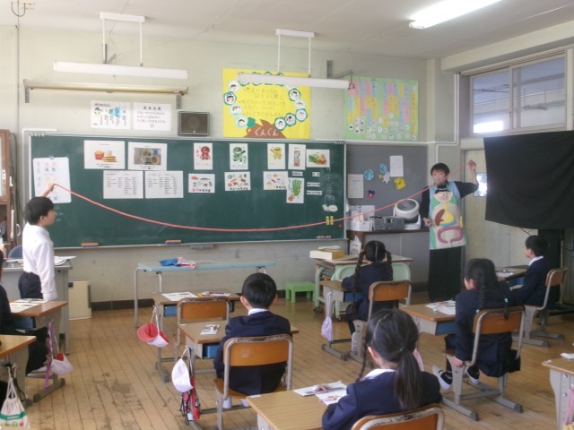 事前のアンケートで子どもたちの好きな食べものは洋食で、嫌いな食べ物は野菜という結果でした。ハンバーガーセットと給食を比較し、食材の種類や食材のそれぞれの働きについて知ることができました。また、実際に4~5メートルある小腸を伸ばし、この中を野菜がお掃除してくれているということも知り、野菜の重要さを再確認していました。学童期は、体が作られる時期です。好き嫌いしないで何でも食べ、健康な体を作っていって欲しいと願っています。