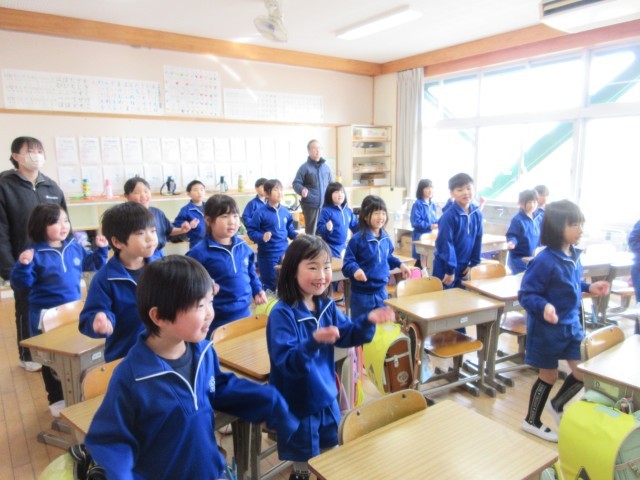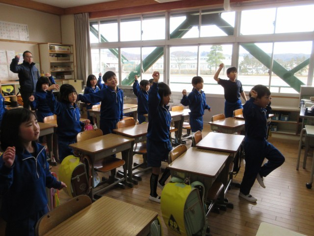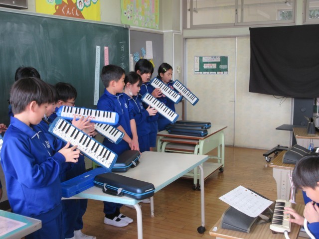 1年生は映像を見ながらポンポンの練習、2年生は4年生に教えてもらいながら鍵盤ハーモニカの練習、3年生は自分たちで鍵盤ハーモニカの練習、4・5年生は6年生に教えてもらいながら楽器の練習。