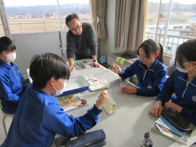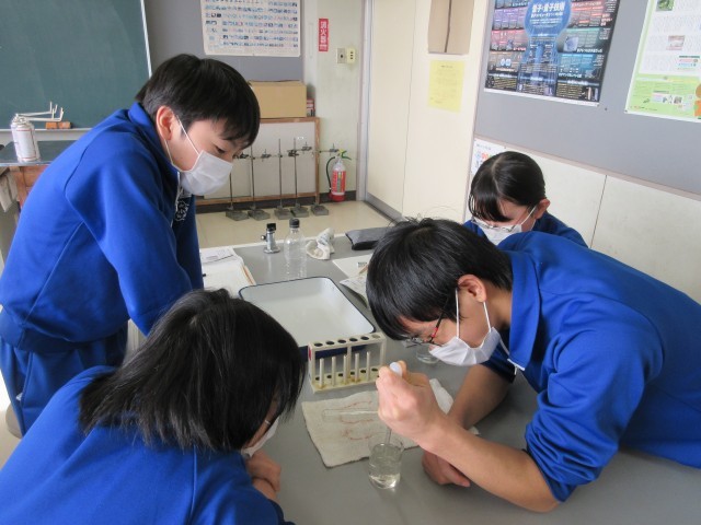 5年生の実験で学習したことを復習しながら、丁寧にピペットなどの器具を扱います。