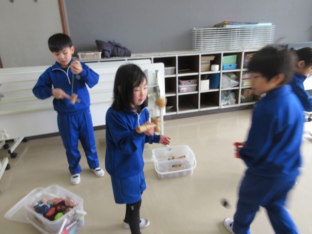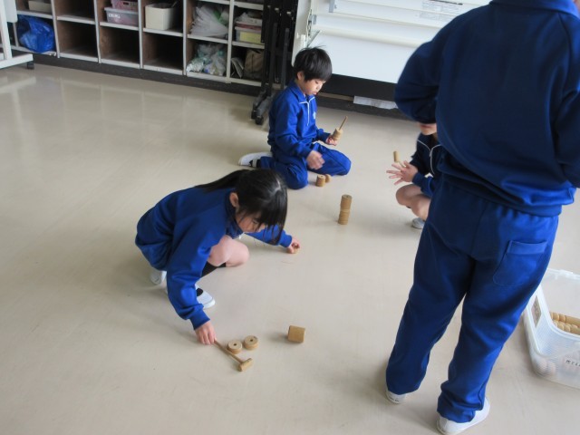 「コマ回し」「けん玉」「お手玉」「だるまおとし」「ヨーヨー」などで楽しく遊びます。