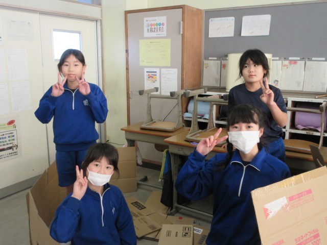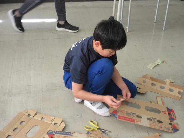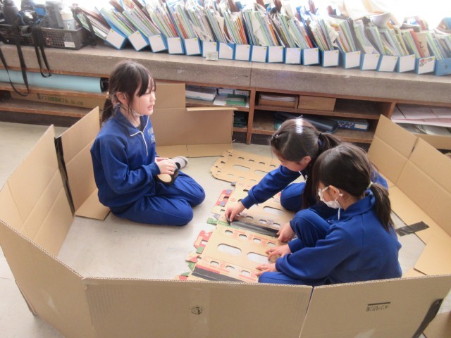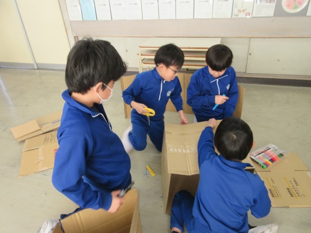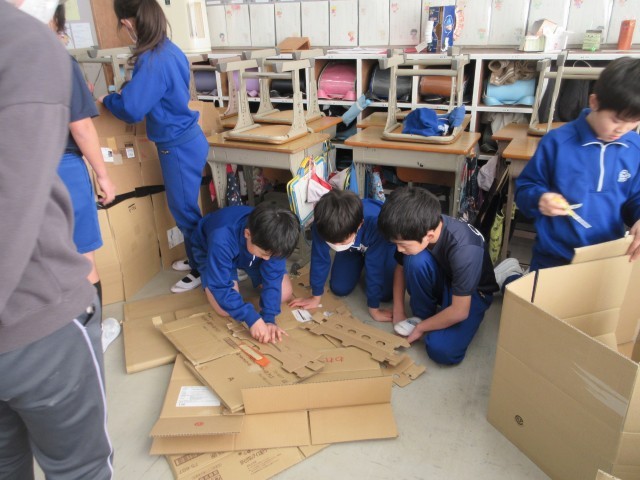4年生の図画工作科の授業では、「みんなでたのしい だんボールランド」の学習です。
