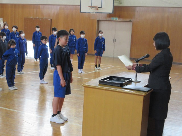 今日の全校集会で、「ふくしまを十七字で奏でよう」で「県北教育事務所絆ふれあい賞」を受賞した5年生の表彰を行いました。