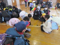 お茶、赤飯、ゴマ塩、すまし汁、花型ハンバーグみたらしソース、おかか和え、お祝いデザートです。