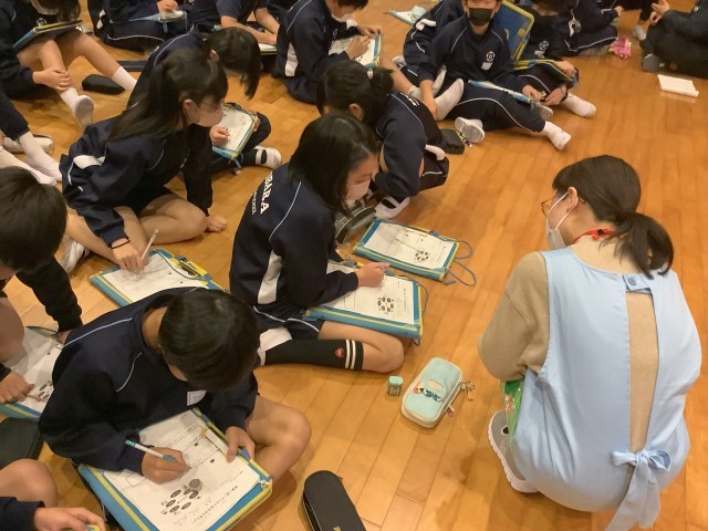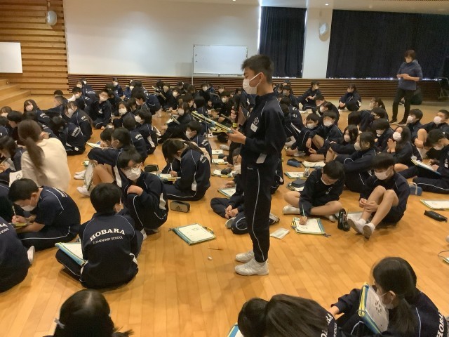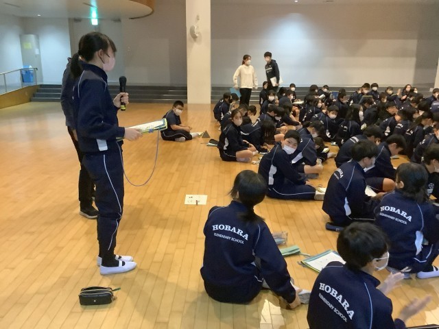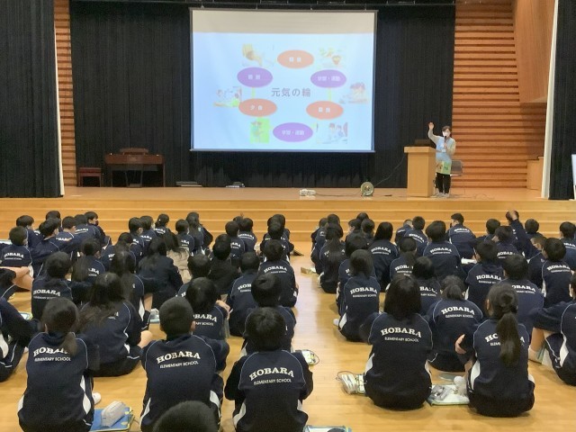 11月26日、6年生は給食センターの栄養士さんにお話をしていただく食育の学習を行いました。最初に、子どもたちの事前アンケートの結果を手がかりに、朝ごはん、給食、おやつ、夕食の食べ方や内容についてや健康に過ごすための食生活について考えました。次に、もし朝食を食べなければ学習や運動はどうなるか、給食の量を考えないと体にどんな影響があるか、おやつの食べ方で気をつけること、コンビニ食や外食についての注意点などについてくわしく説明していただきました。最後に、生活習慣病を防ぎ「元気の輪」を保つために、子どもたちはそれぞれに自分の食生活を見直し、問題点や改善点について考えました。子どもたちは、家庭でも食生活を改善する取り組みを行いたいといった感想を発表していました。