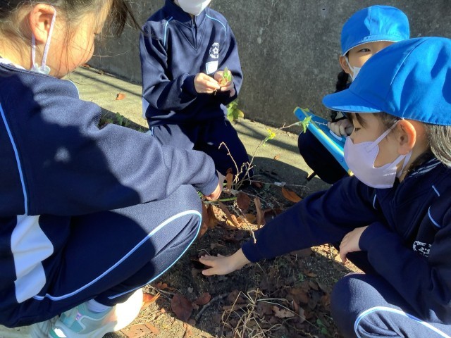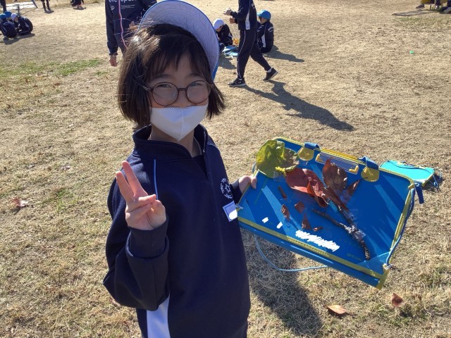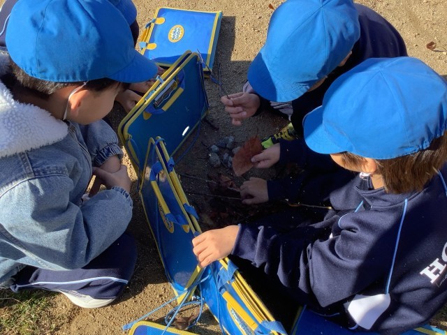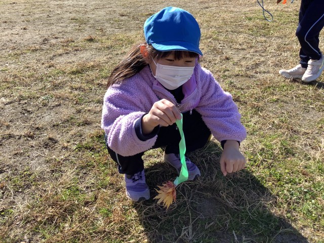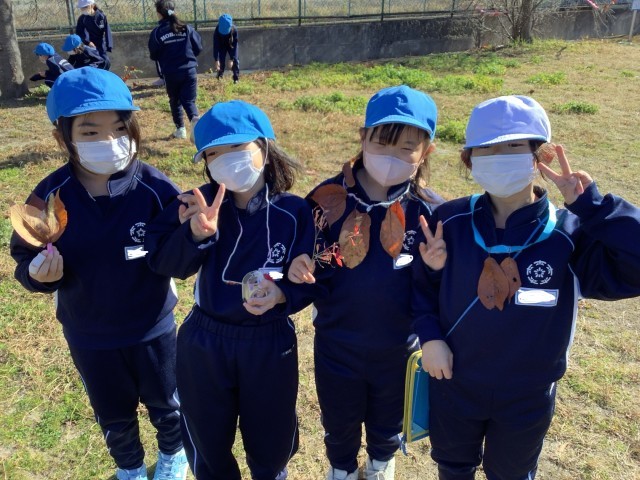先週の図工では、なかよし公園へ行って「しぜんからのおくりもの」の学習をしました。落ち葉や木の実などの秋の自然を見つけ、すずらんテープに貼り付けて木や遊具に飾ったり、毛糸と落ち葉でアクセサリーを作ったり、お店屋さんごっこをしたりして、創作活動を楽しんでいました。