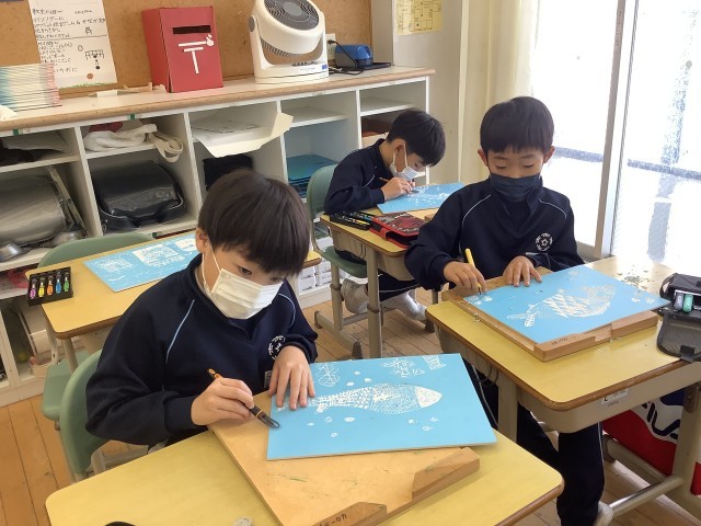 初めての彫刻刀で,様々な線や模様を丁寧に,そして思い思いにほっています。