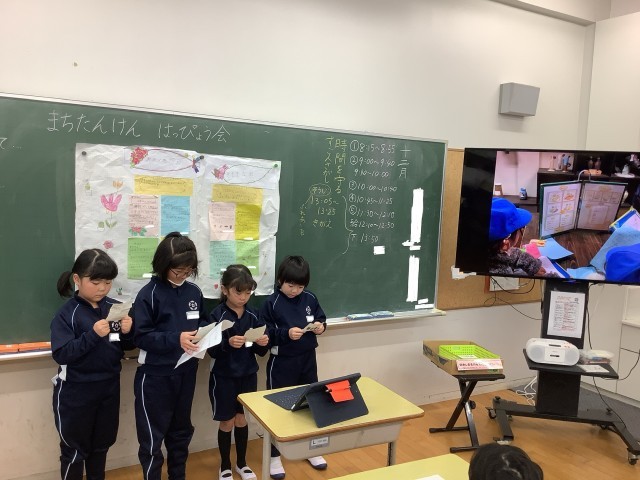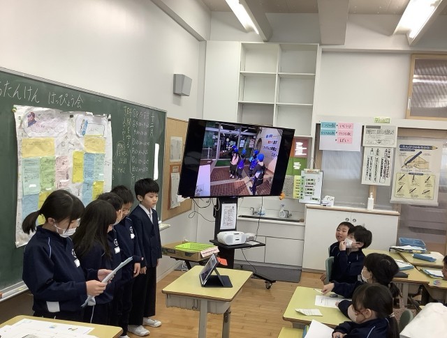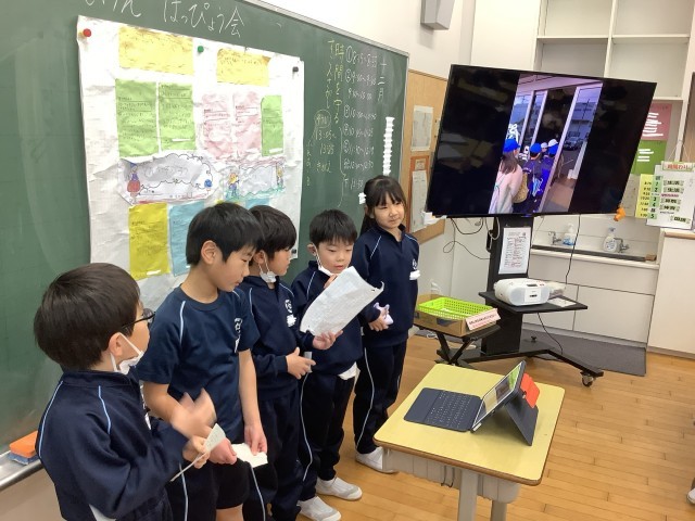 生活科の時間では、町たんけんで調べたことをまとめ、それを発表する活動を行いました。朝からドキドキしていた子どもたちでしたが、ボランティアの保護者の方が撮ってくださった動画や写真も使いながら、それぞれ工夫をして発表していました。自分たちが住んでいる保原町のよさに改めて気づくことができました。