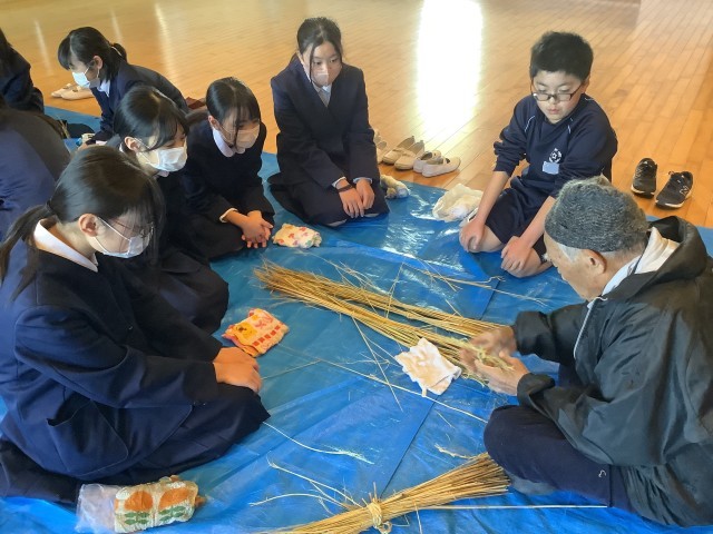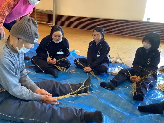 藁を手のひらで擦り合わせて1本の縄にしていくことがなかなか難しい技で,講師の先生方に丁寧に教えていただきながら,完成させることができました。