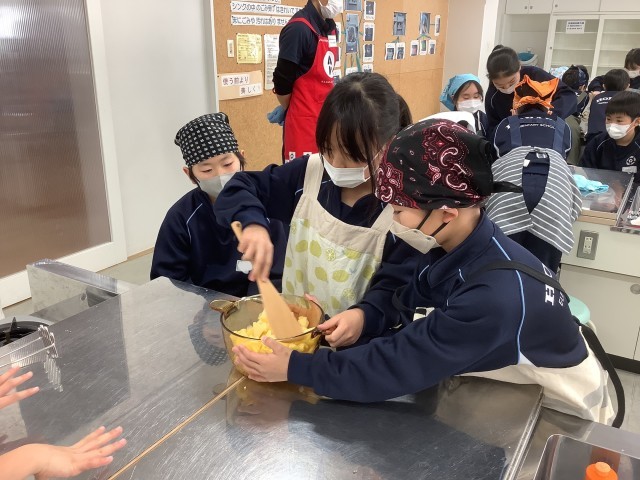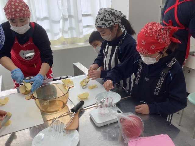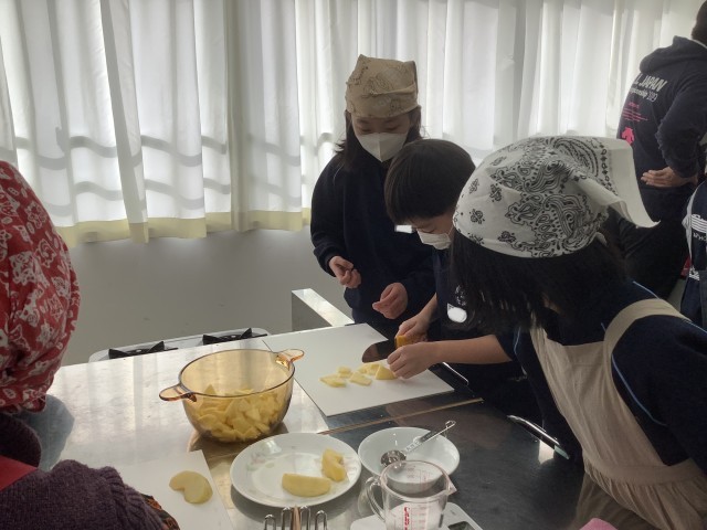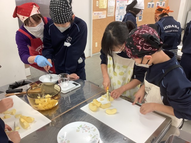 みんな,りんごを自分で切ったり砂糖の量を測ったり,砂糖とりんごを混ぜたりする経験をさせていただきました。