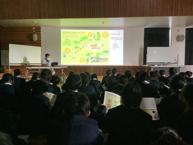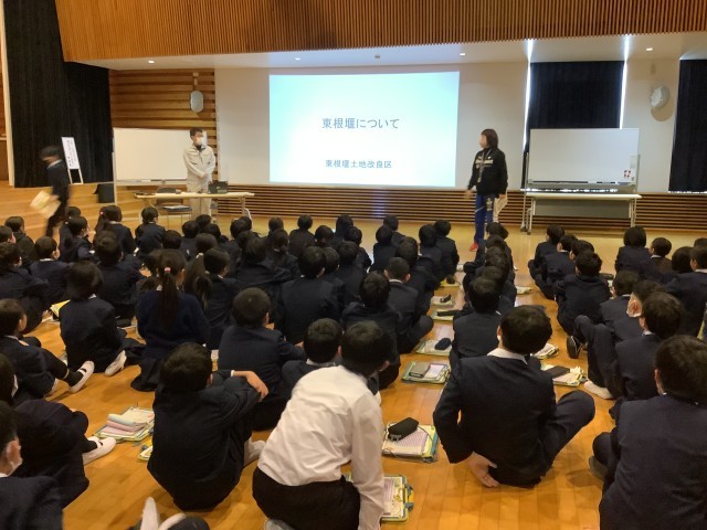 4年生では,社会科の学習で田んぼや畑への水はどのように引かれているのかについて学習します。東根堰土地改良区の方に来ていただき,歴史や働きについてお話を聞きました。地域にある先人達の知恵を詳しく学ぶことができました。