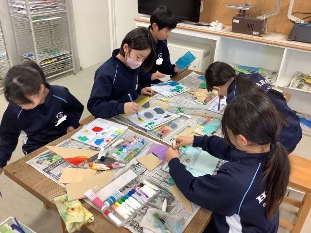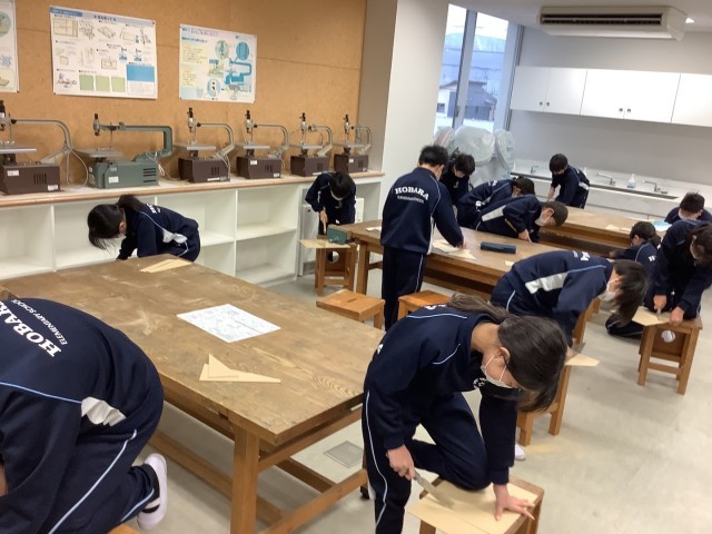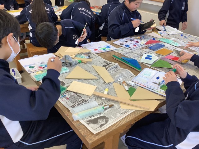 図工の時間には,のこぎりで板を切り,色を付け組み合わせて作品を作ります。どんな作品ができるのかな?