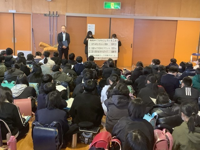 2月25日、6年生は桃陵中学校へ見学に行きました。はじめに校長先生や中学校の先生方に中学校での学習や生活についての説明をしていただきました。次に1年生の授業の様子や清掃活動を見学しました。最後に部活動の様子を見学した子どもたちは4月からの新生活に胸をときめかせていました。小学校生活もあとわずか、4月からの中学校生活が楽しみです。