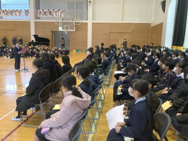 3月3日、6年生は下級生たちに「6年生を送る会」を開いていただきました。楽しいゲームや思い出クイズ、色紙のプレゼント、歌に合わせたメッセージなどを下級生たちからいただき6年生は楽しいひとときをすごしていました。最後に、6年生から下級生に合奏とメッセージを贈りました。5年生が中心となり企画した「6年生を送る会」、卒業が間近に迫った6年生にとって下級生との心温まる素敵な時間となりました。どうもありがとうございました。