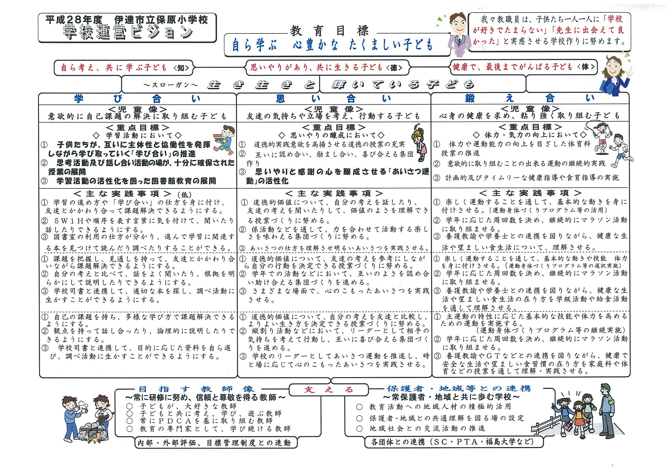 学校運営ビジョン 公開日 2016/05/08 更新日 2016/05/08 学校経営・運営ビジョン 保原小学校の平成28年度の「学校運営ビジョン」です。 ※ ここをクリックするとpdfファイルを見ることができます。 いいね(0)