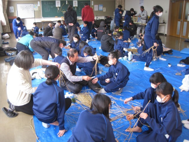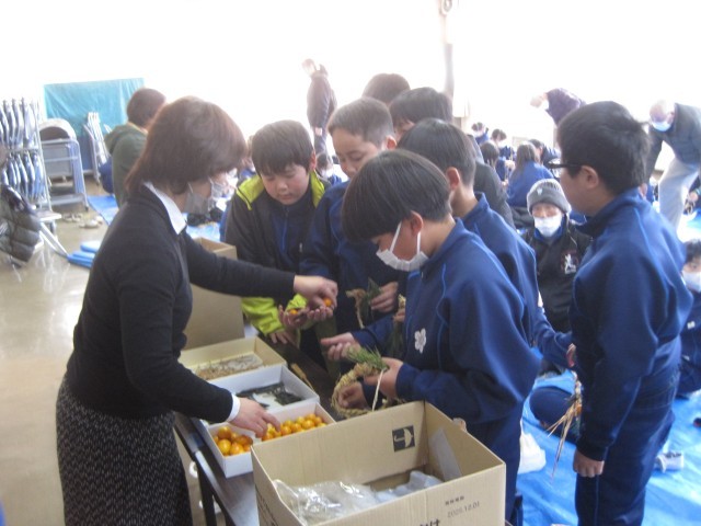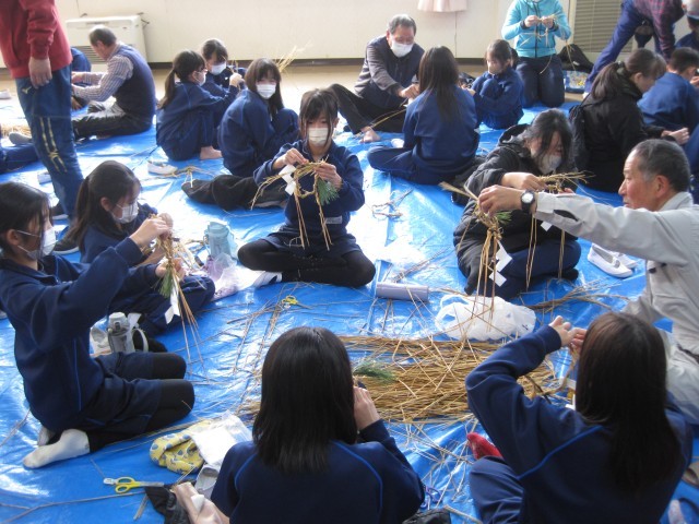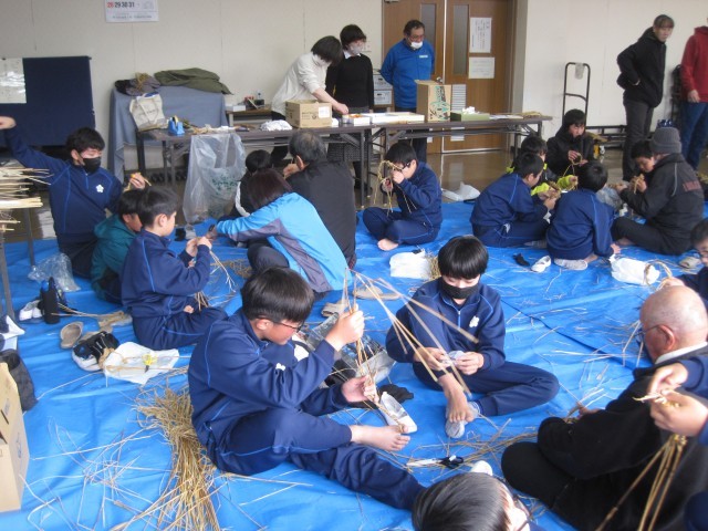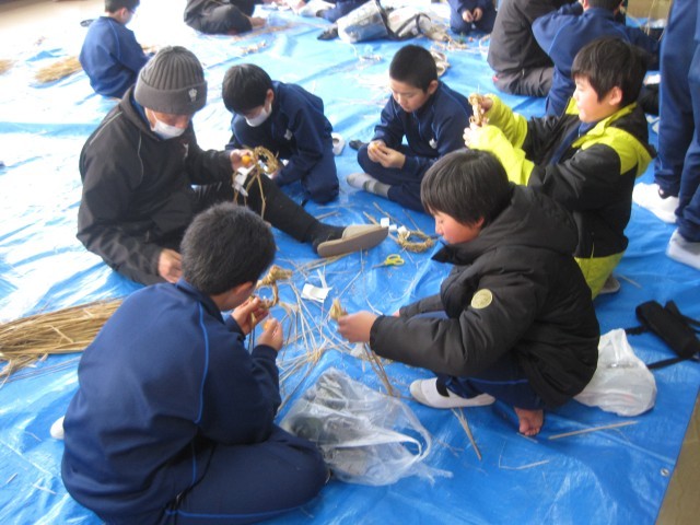 地域のみなさんに教わりながらしめ縄作りを行いました。初めての体験に苦労しながらも、何とかしめ飾りを完成させていました。教えていただいた皆様ありがとうございました。