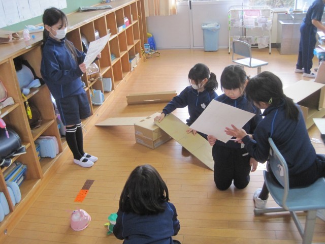 みんなで相談をしながら進めています。遊び方の説明の練習もしています。