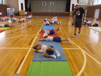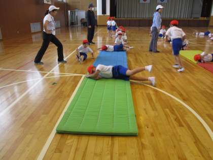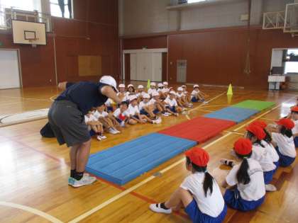 棒転がりや壁倒立の練習を行いました。アドバイザーの先生に声かけをしてもらい,楽しく練習ができました。