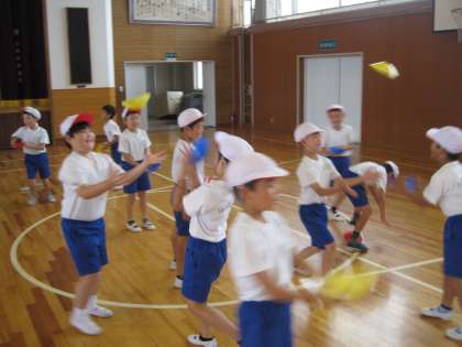 6月18日月曜日、今日は健やか教室が実施されました。体育で使用するマーカーを投げたり、取ったり、走ったり、楽しく体を動かしました。