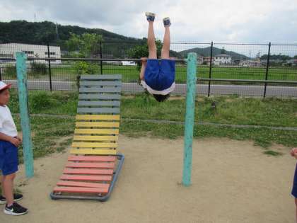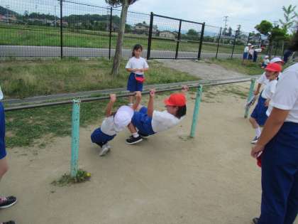 上保原小には、鉄棒大好きな子どもたちがいっぱい。