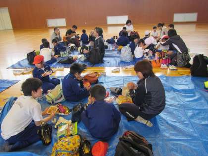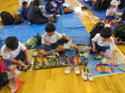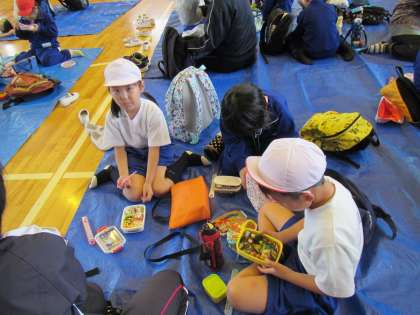 学校の体育館で、大きなシートを広げ、おいしくお弁当を食べました。
