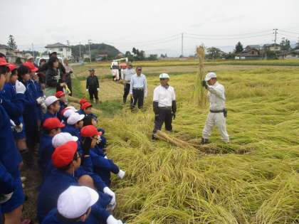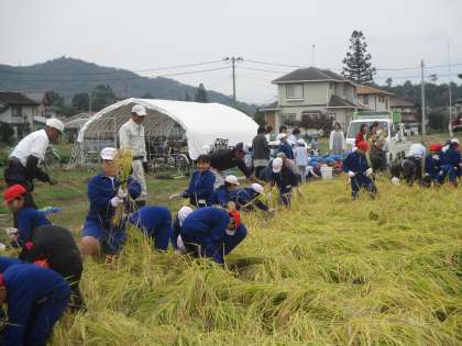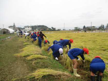 今日は待ちに待った稲刈りの日です。田んぼの先生からお話を聞いた後,鎌を上手に使って稲を刈りました。頑張って活動しました。(5年生)