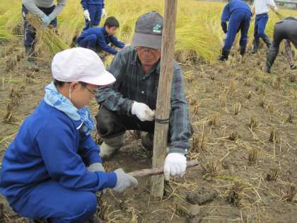 杭をうって稲を重ねて干しました。一ヶ月乾燥させるそうです。