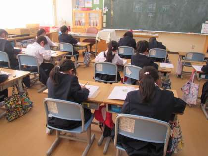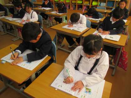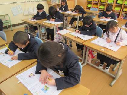 1年生は、姿勢を整えて、書写の授業。